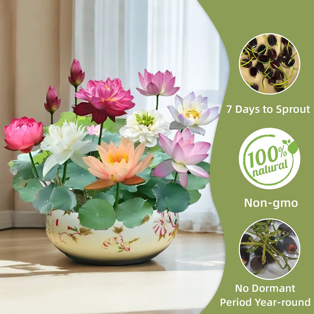 These lotus seeds are naturally drought-tolerant, heat-resistant, and adaptable to most indoor and outdoor environments. Once germinated, they bloom continuously from early summer to late autumn (about 4-5 months), offering long-lasting colorful blooms that stay vibrant and fresh, bringing enduring beauty to your home.