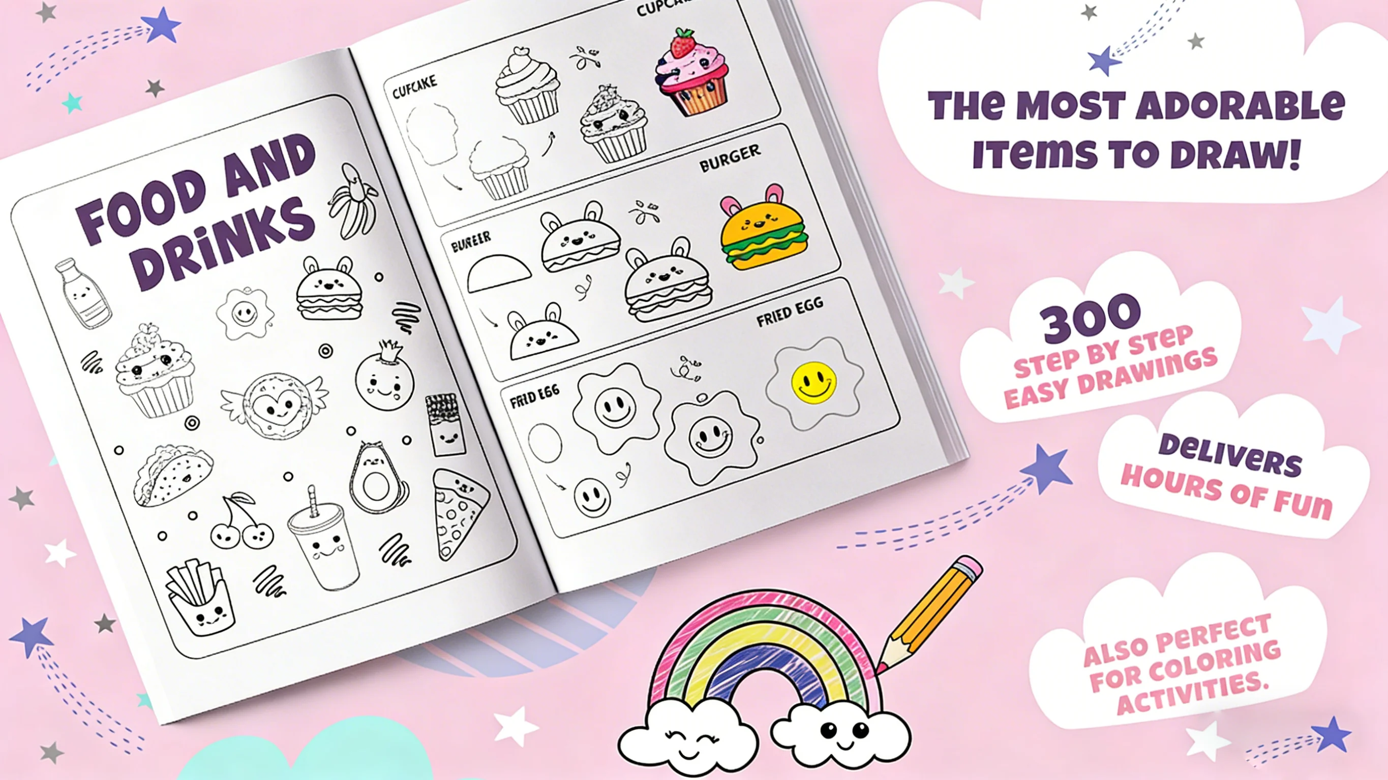 From adorable animals (real and imaginary)、tasty treats、trendy outfits to magical fantasy creatures, this book covers endless topics to keep kids engaged. It’s a one-stop creative library that sparks curiosity—no more running out of fun things to draw, perfect for rainy days, travel, or screen-free downtime.